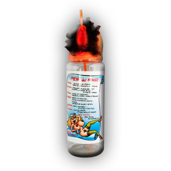 Cubalitro en forma de vagina natural con vello y capacidad para 750 ml. Incluye pegatina con dibujo, texto con el menú del novio y espacio para dedicatorias.