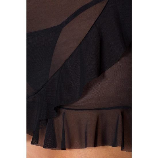 Sexy vestido semitransparente negro anudado con collar al cuello, con volante y tanga a juego de la prestigiosa colección Kiss Me.